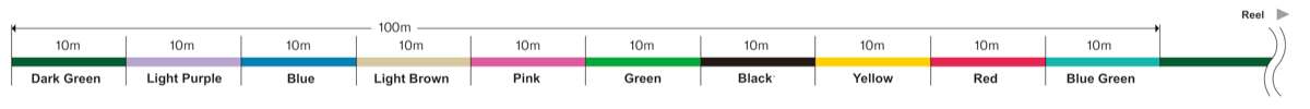 Ultra-strong, extremely thin 8-strand braided Max Power PE (MAX-PE) fishing line for jigging. Super smooth surface and astounding abrasion resistance. 10 x 10 metered-color system (10 colors every 10 meters) for exact line and depth measuring. Quickly leads bait and jig to correct depth range.